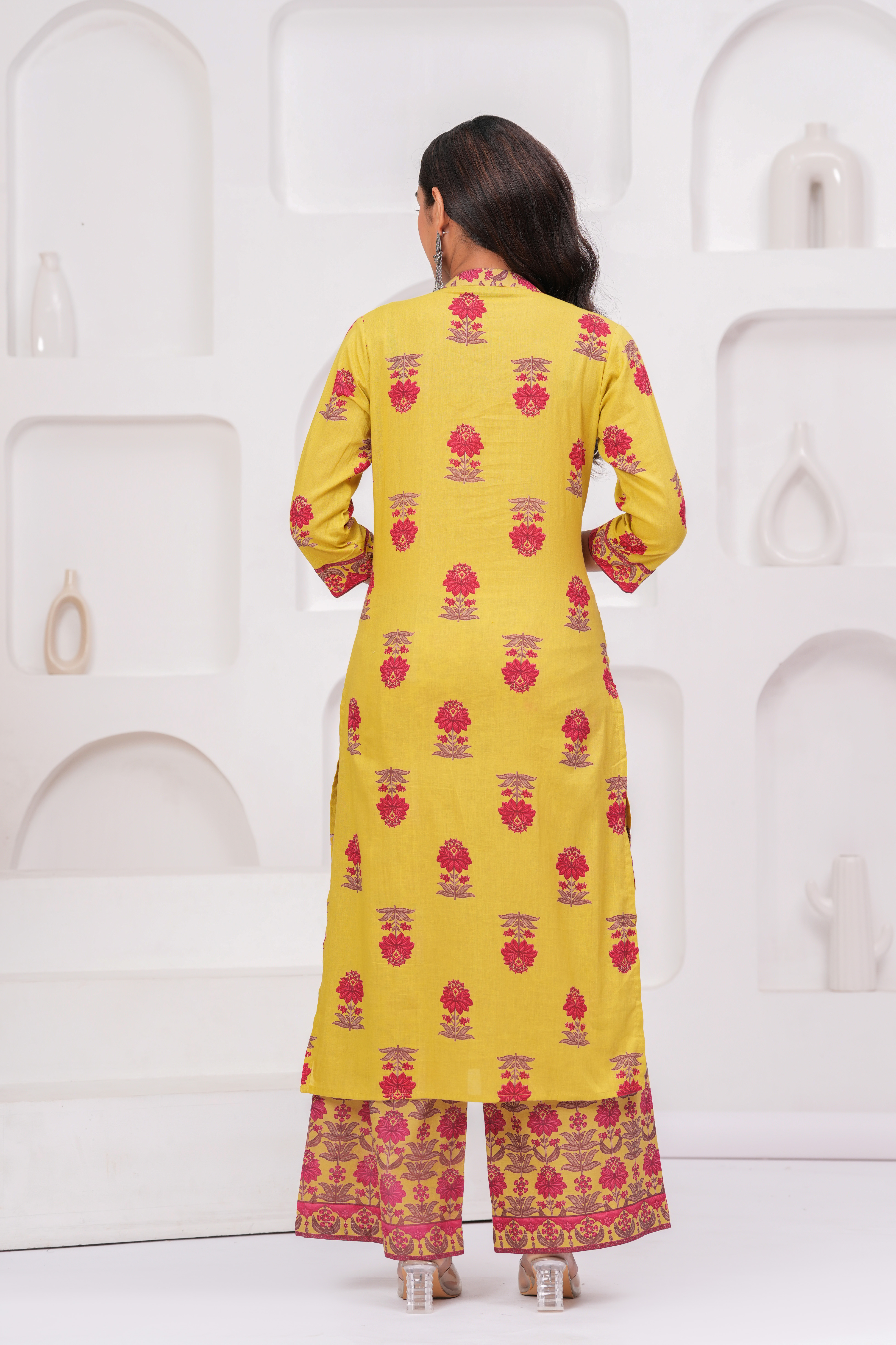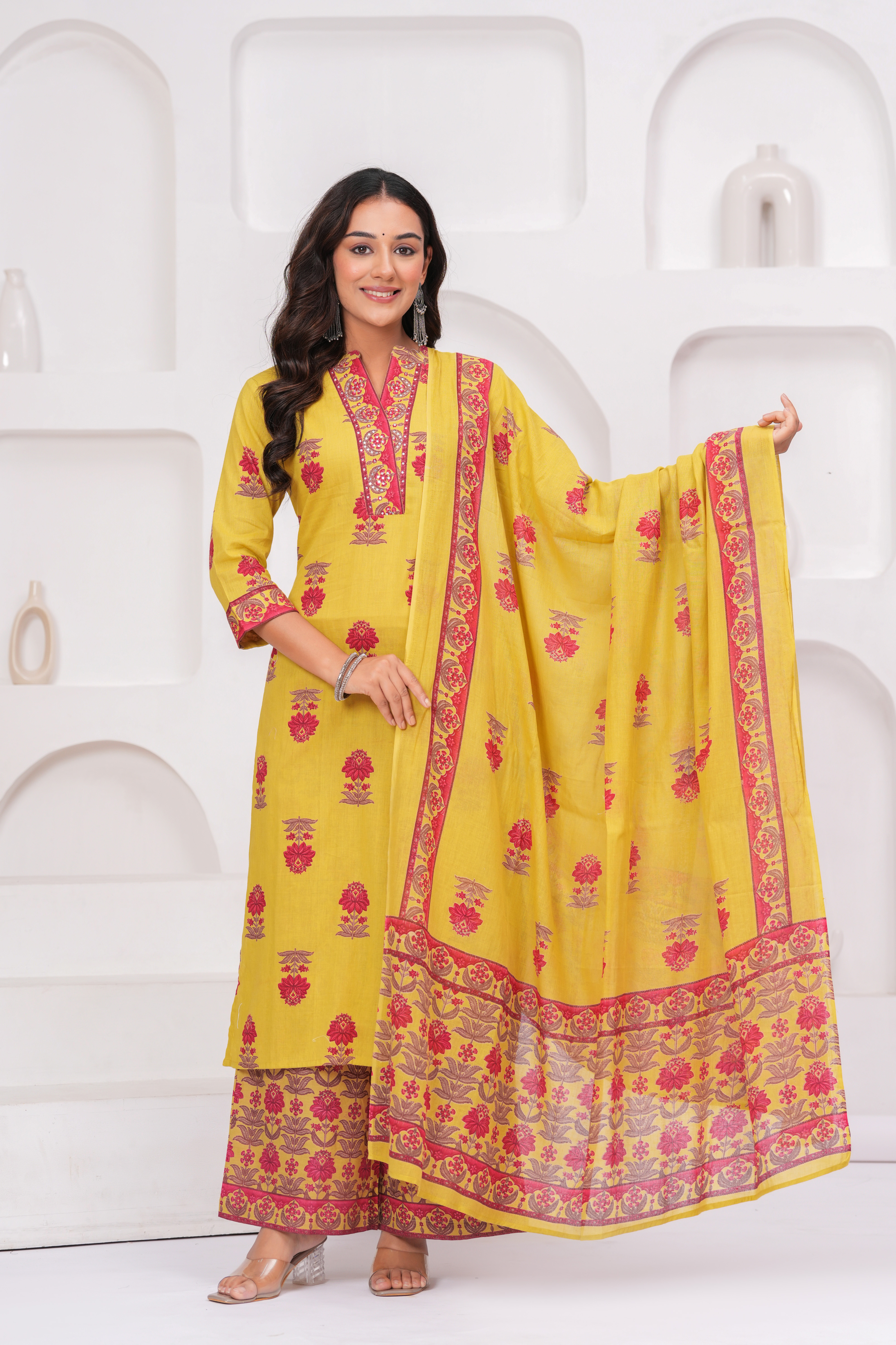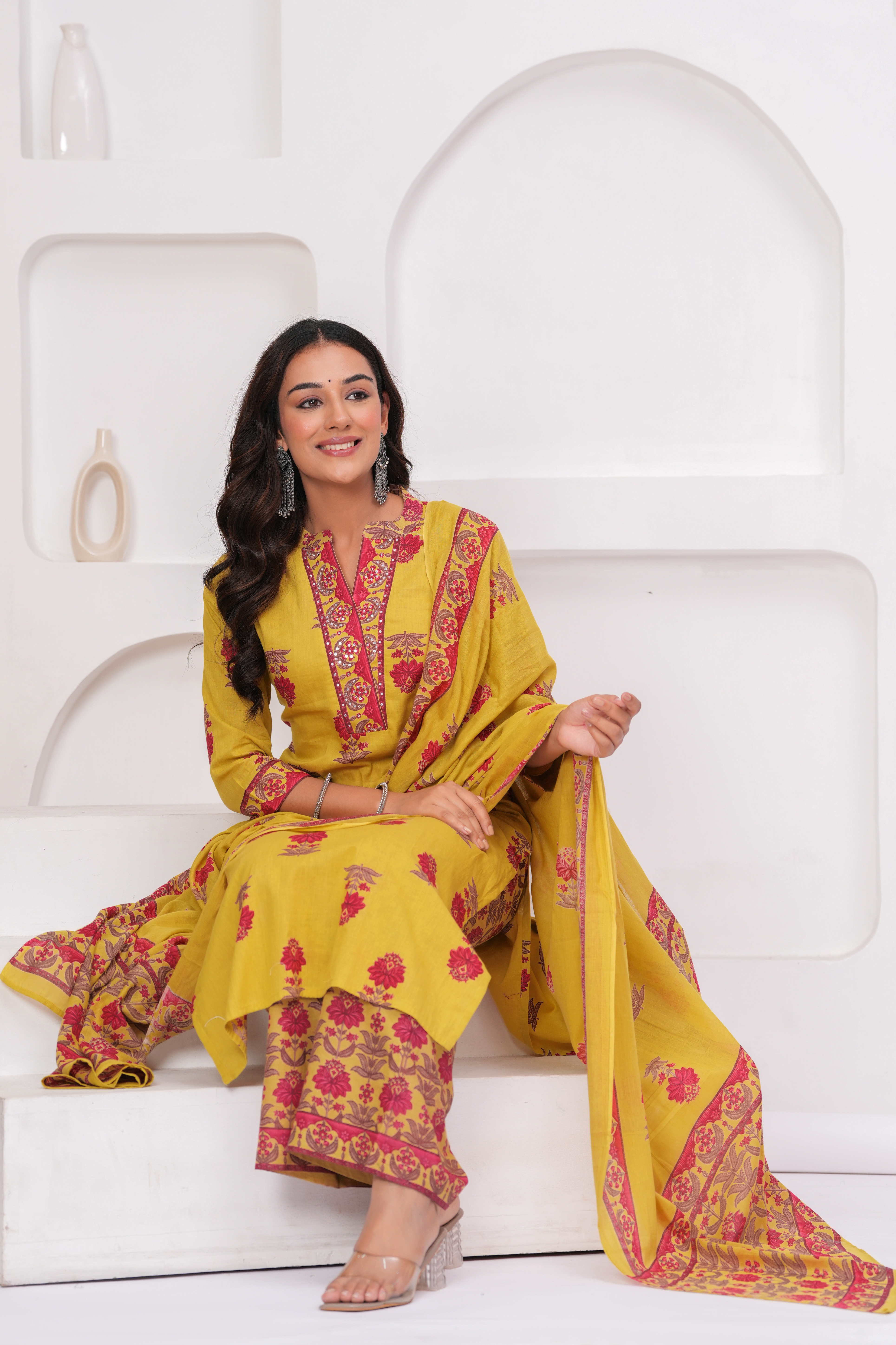 Radiate festive charm with this mehndi-yellow cotton suit set, designed with intricate red floral prints that beautifully enhance its traditional appeal. The straight-cut kurta features a delicately printed neckline and sleeves, paired with wide-leg printed palazzos that add both comfort and elegance. The coordinated dupatta, bordered with floral motifs, completes the look with a perfect ethnic touch. Crafted from breathable cotton fabric, this set is ideal for festive occasions, casual gatherings, or day functions, offering a vibrant yet graceful presence.