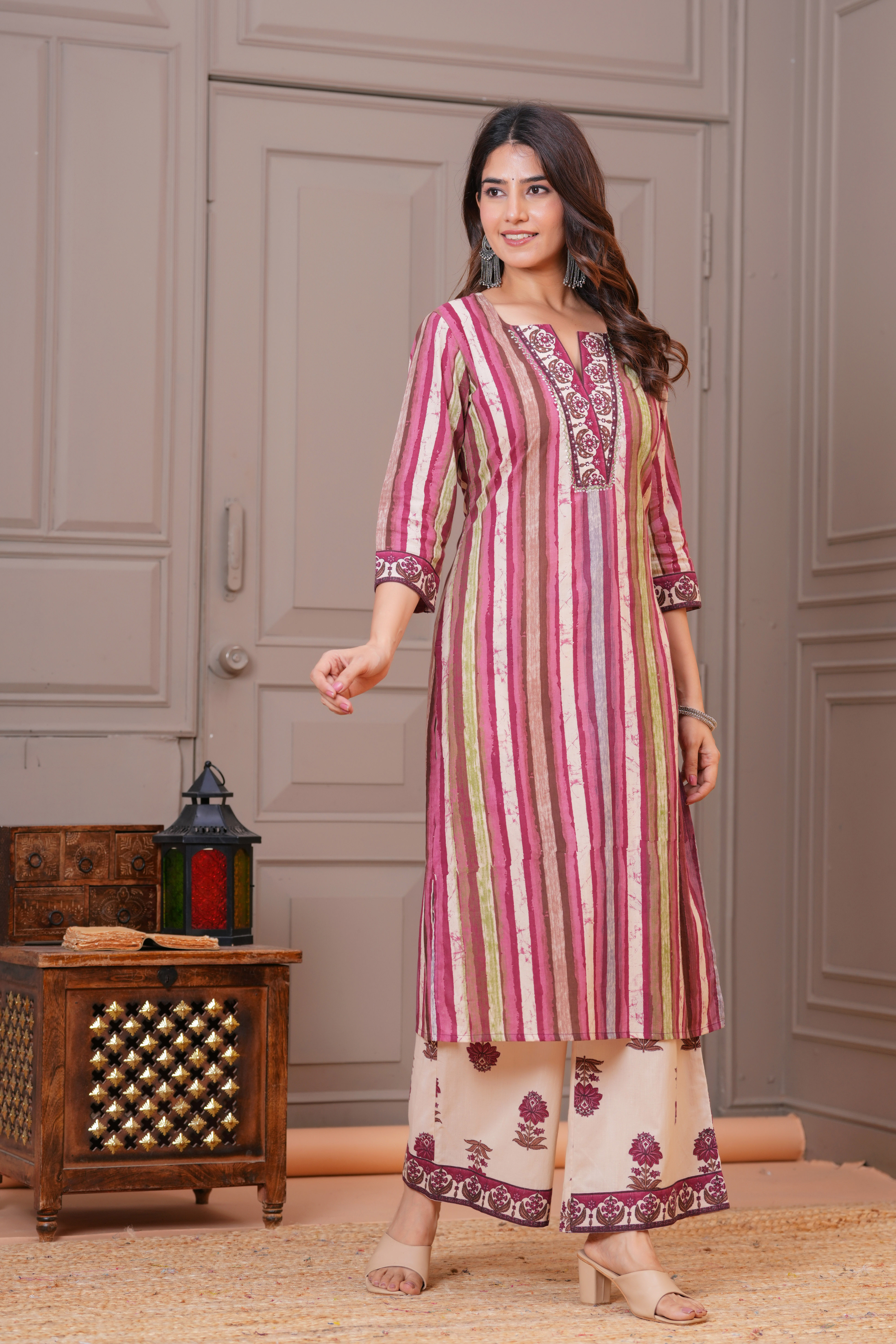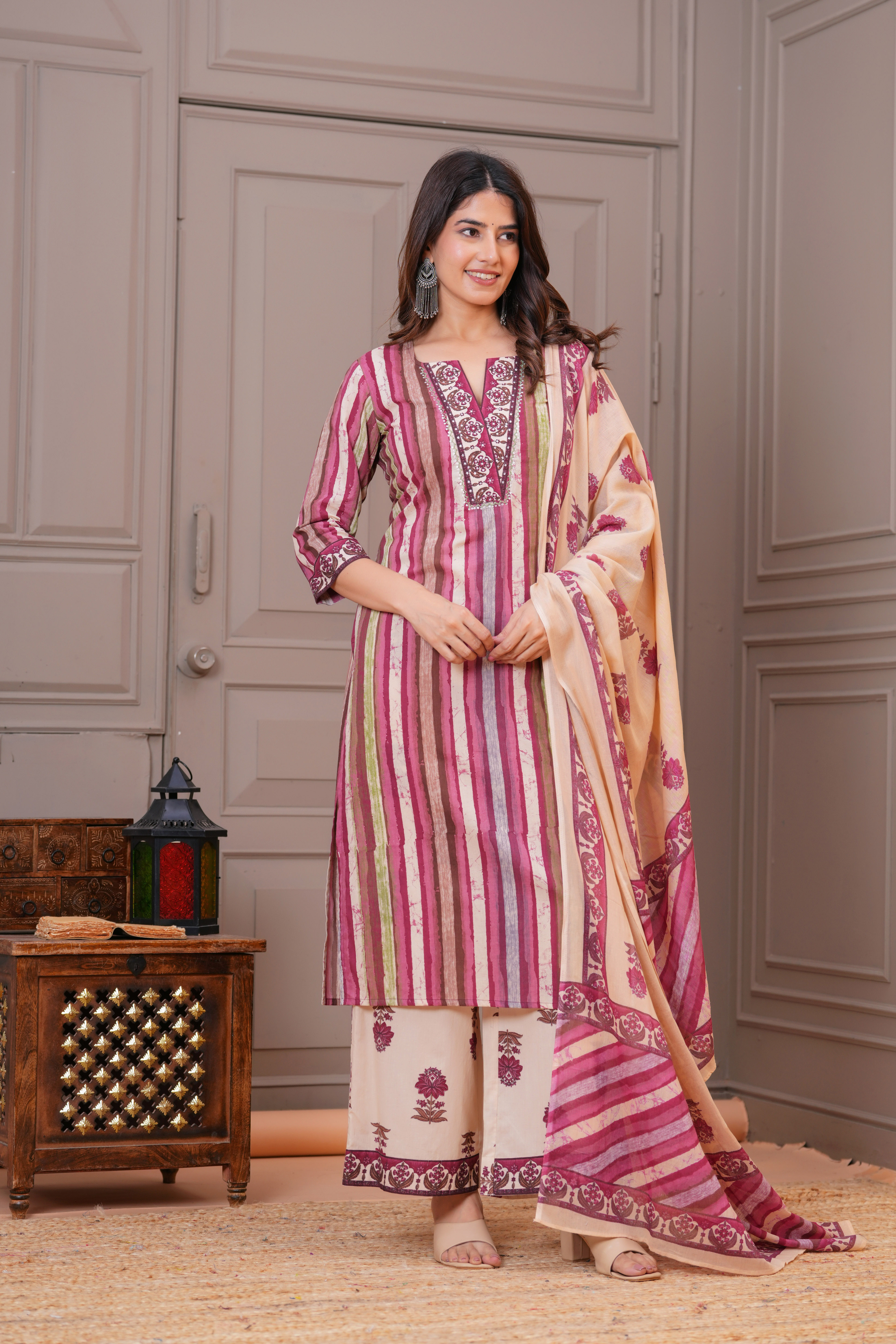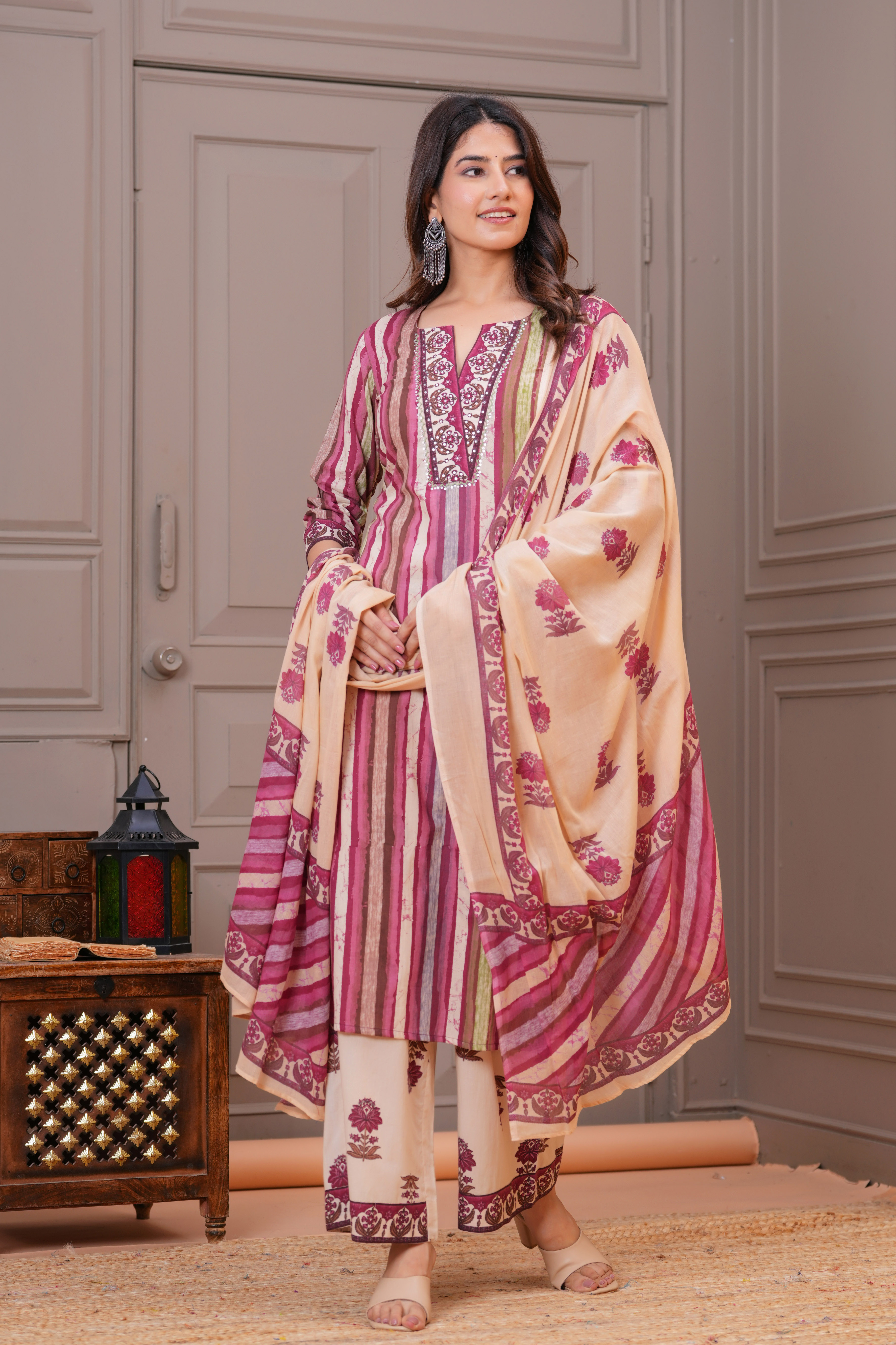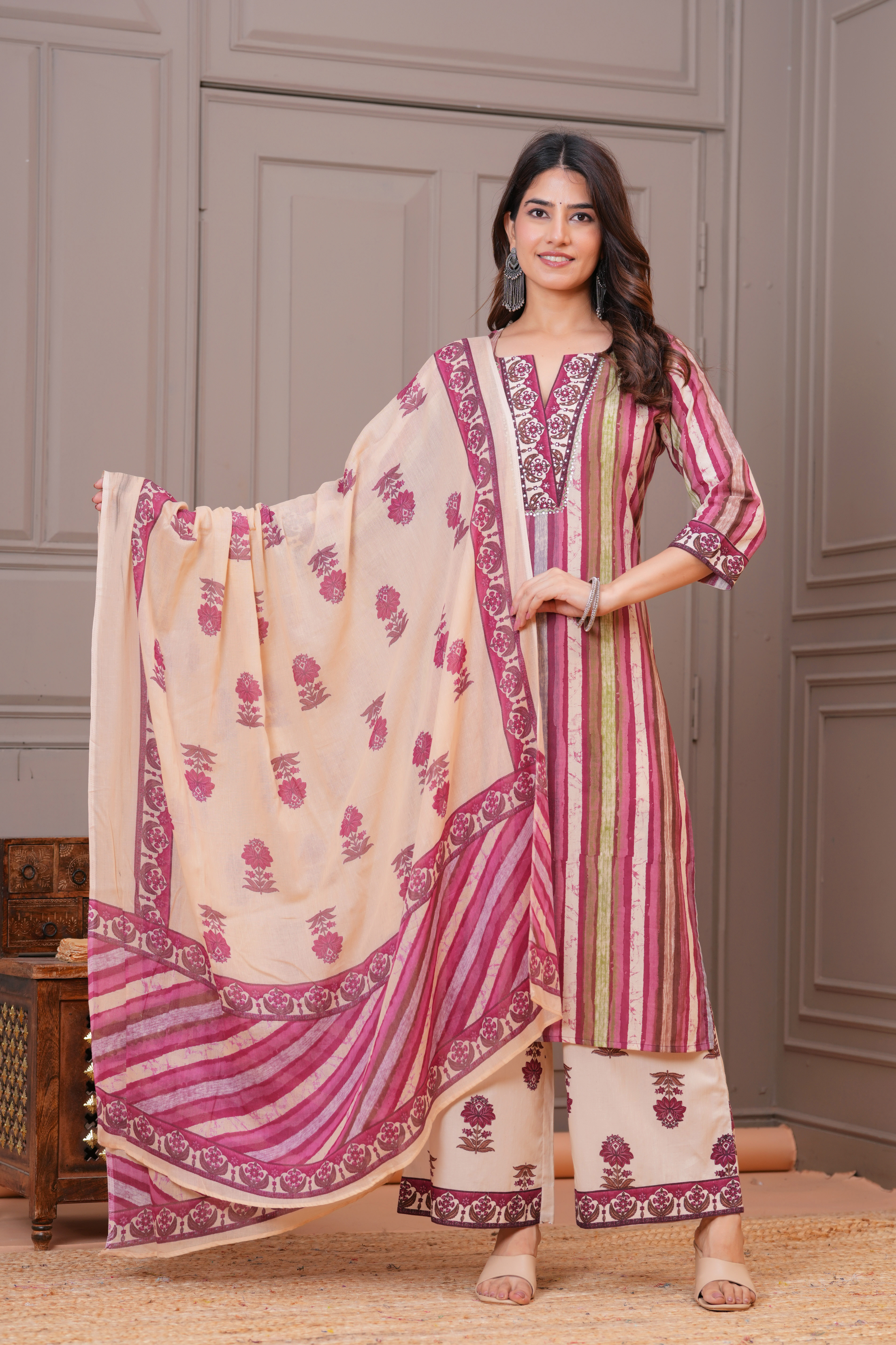 This cotton kurta set showcases a beautiful harmony of floral and stripe prints in elegant shades of Pink. The straight-cut kurta features a finely embroidered V-neckline with 3/4 sleeves and coordinated printed borders. The matching palazzo adds a subtle floral touch that complements the kurta’s vertical stripe pattern. Paired with a soft cotton dupatta featuring coordinated floral motifs and a bordered edge, this ensemble offers a graceful and feminine look — perfect for casual outings and festive gatherings.