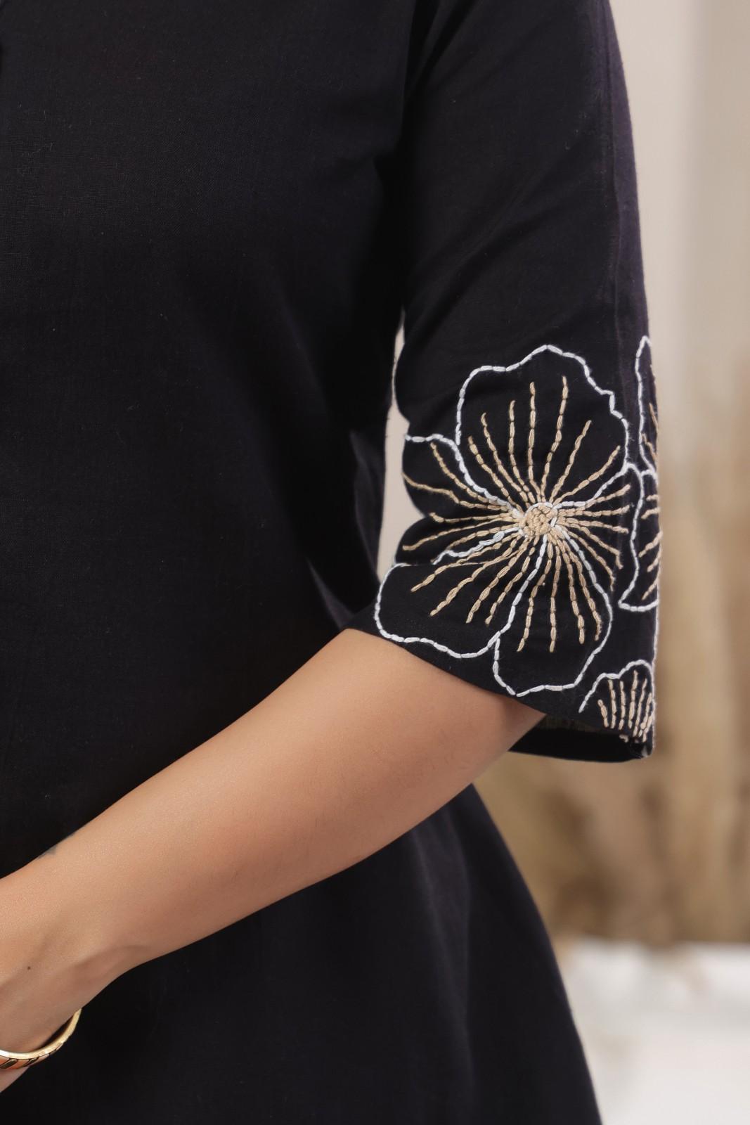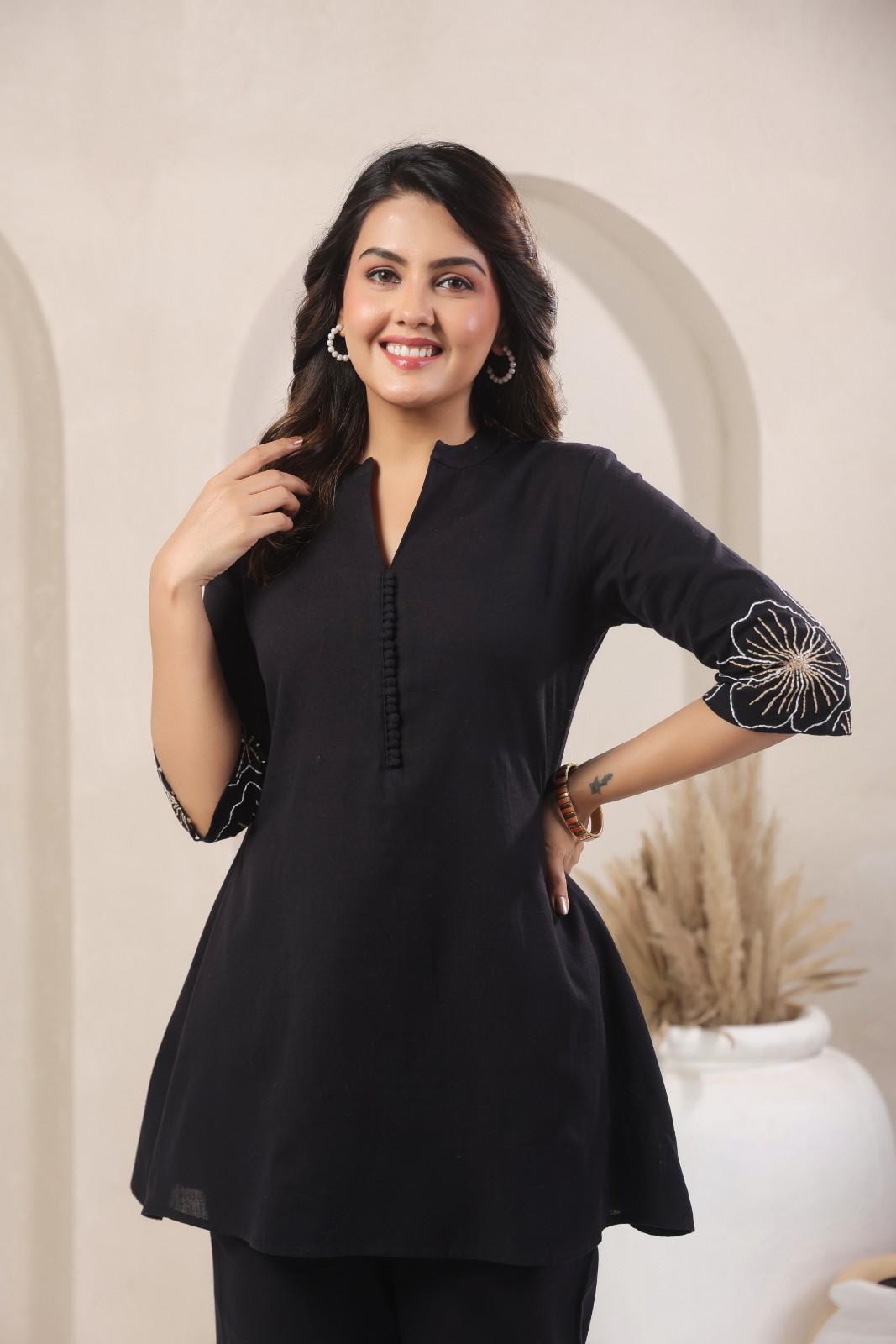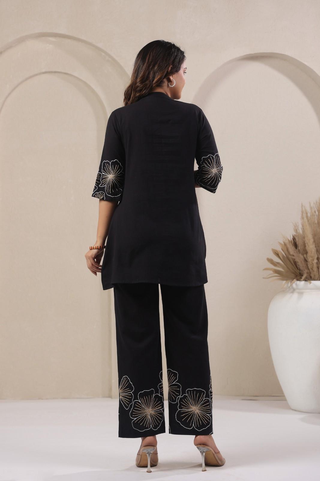 Elevate your style with our stylish A line Coord set for office and daily use, featuring chinese collar with slash neck, front potli button, thread embroidery done on sleeves and bottom that provides a chic and feminine Silhouette, making a great choice for office and daily ready.