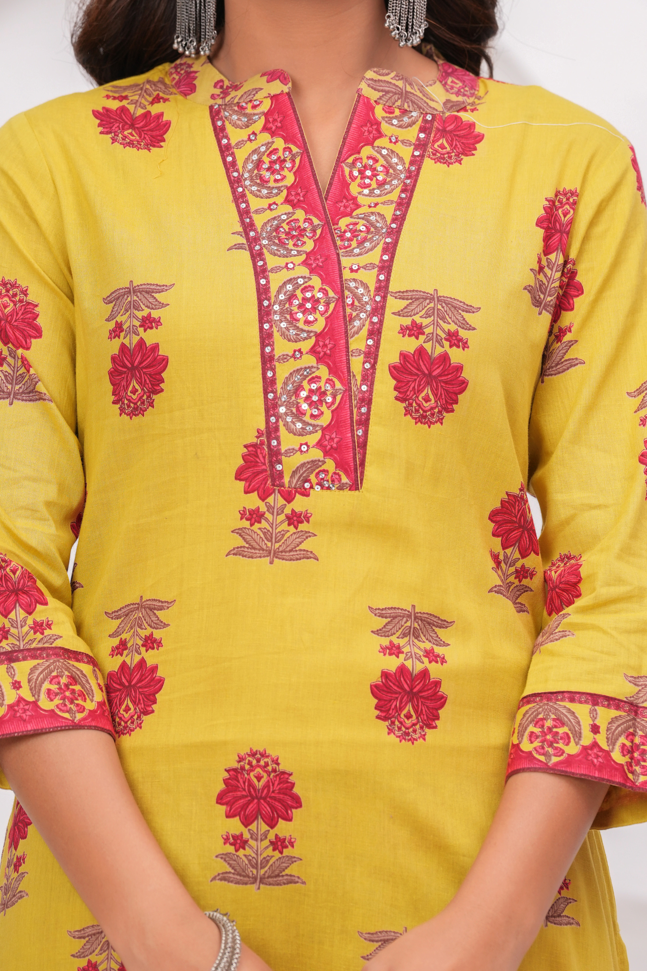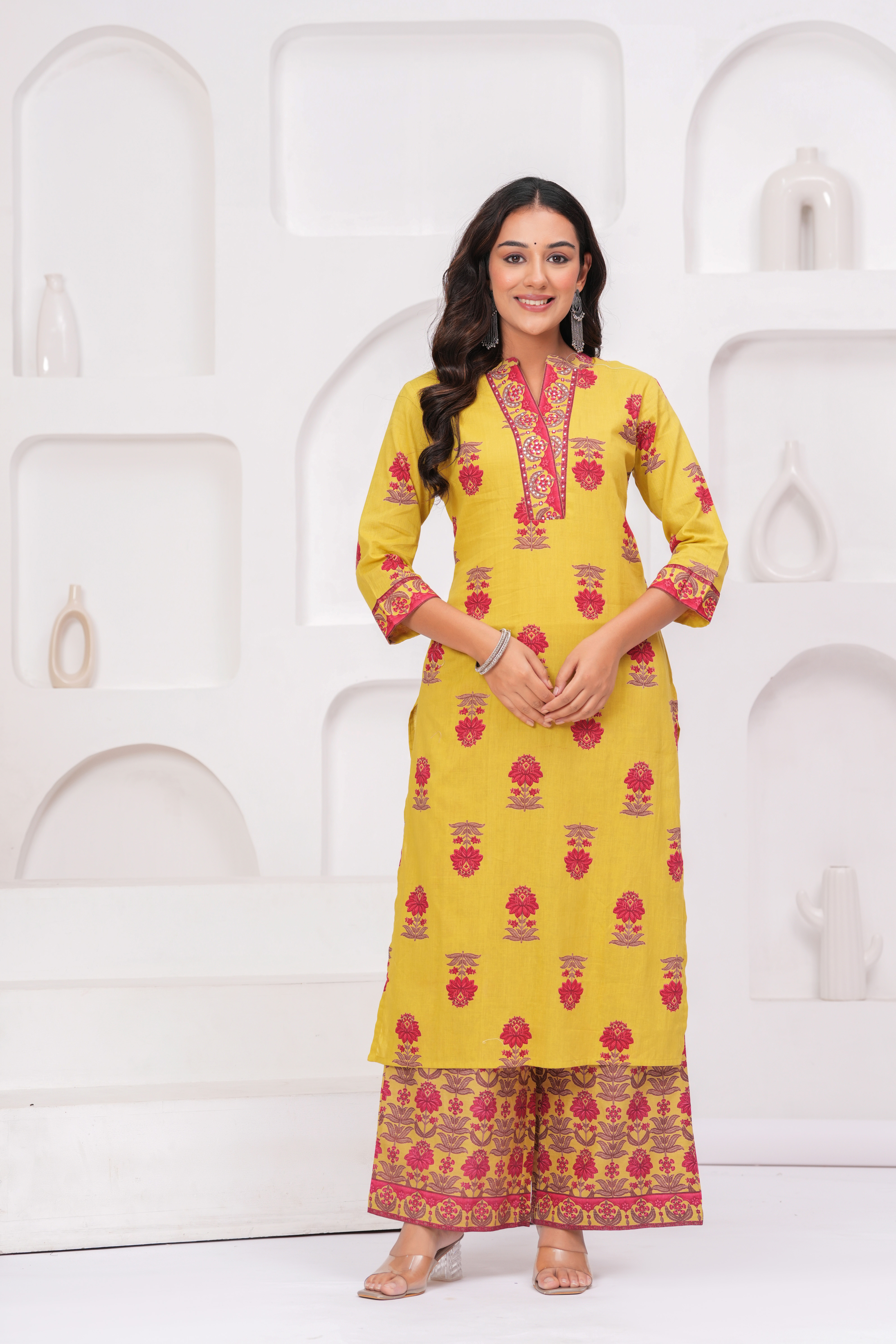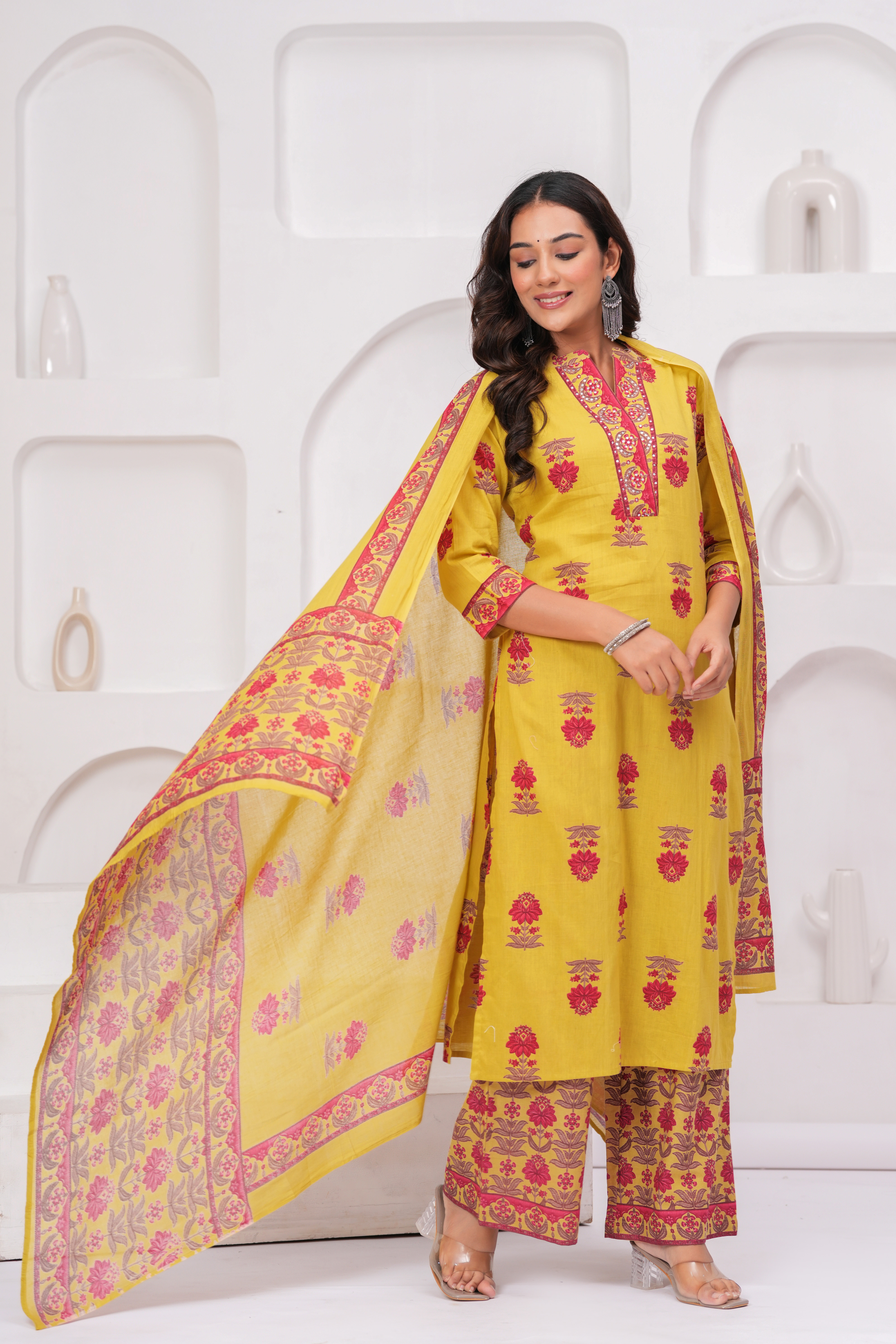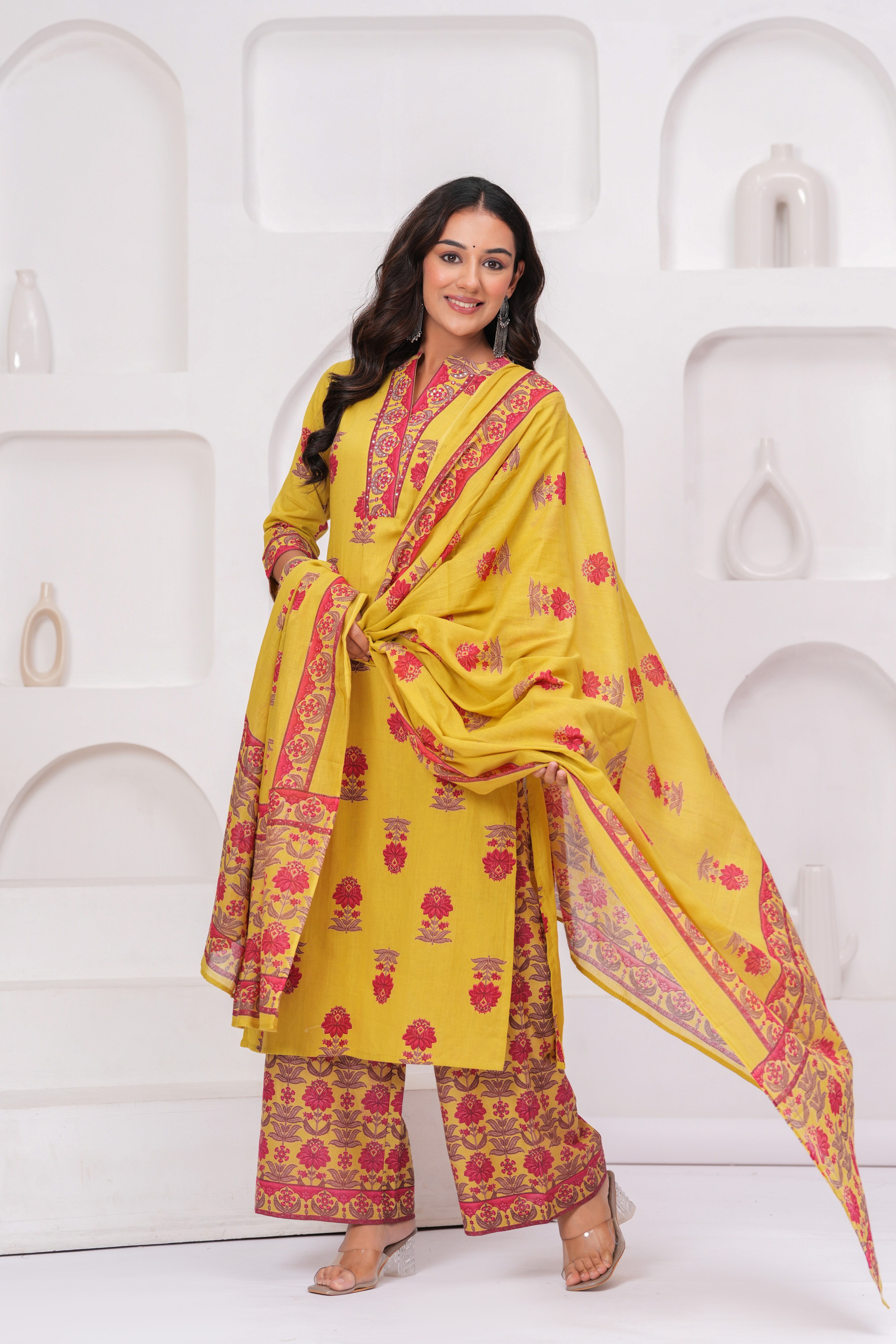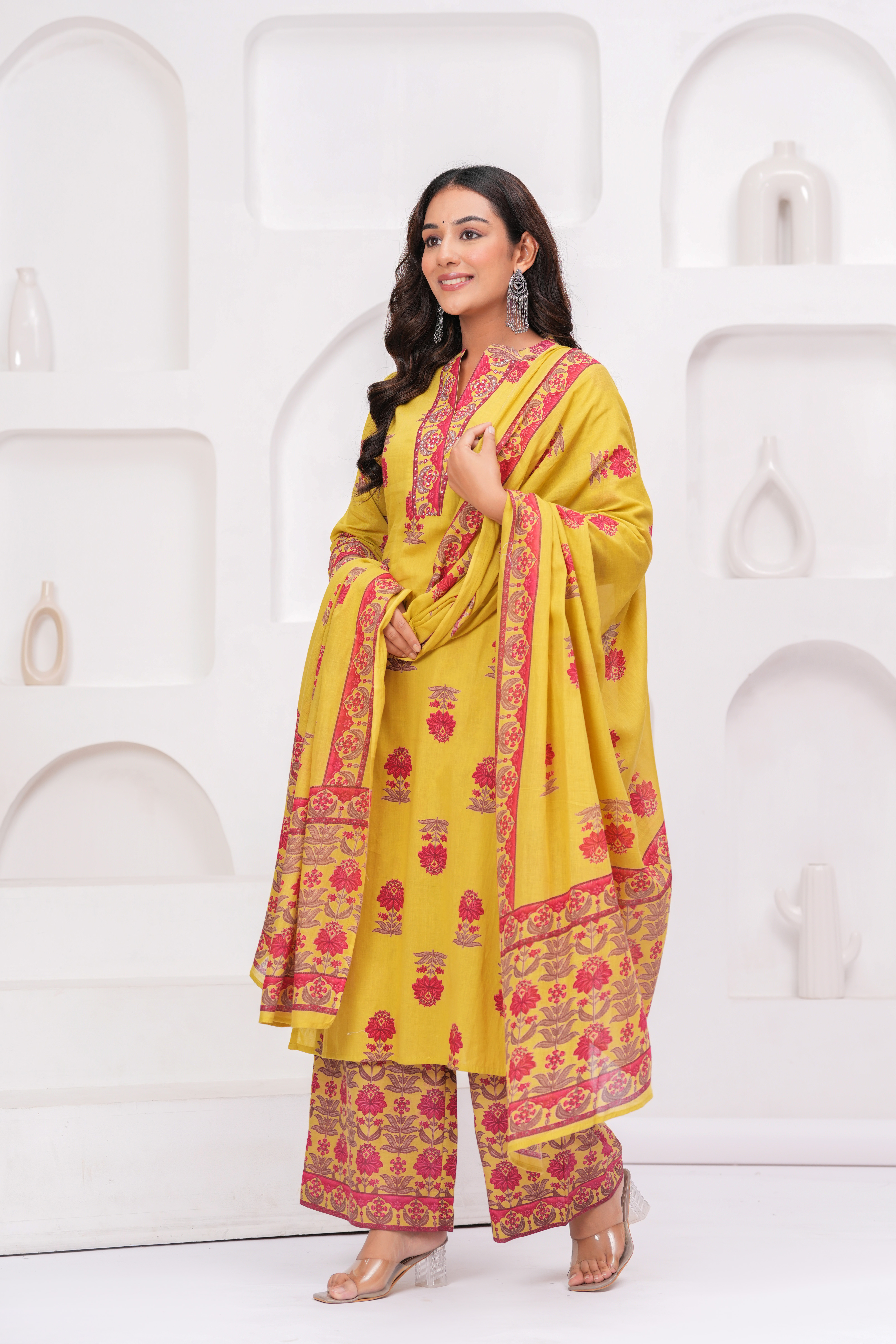 Radiate festive charm with this mehndi-yellow cotton suit set, designed with intricate red floral prints that beautifully enhance its traditional appeal. The straight-cut kurta features a delicately printed neckline and sleeves, paired with wide-leg printed palazzos that add both comfort and elegance. The coordinated dupatta, bordered with floral motifs, completes the look with a perfect ethnic touch. Crafted from breathable cotton fabric, this set is ideal for festive occasions, casual gatherings, or day functions, offering a vibrant yet graceful presence.