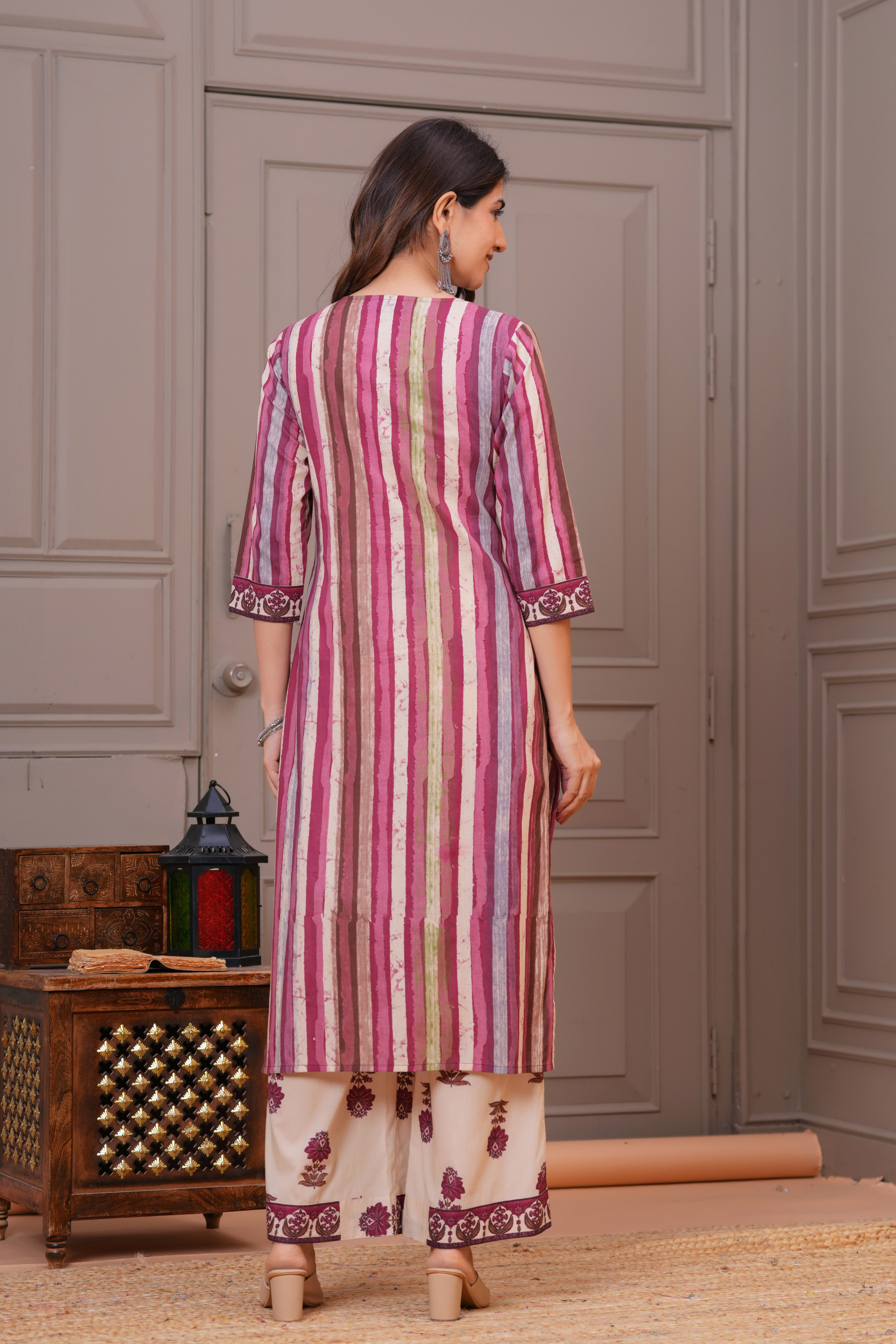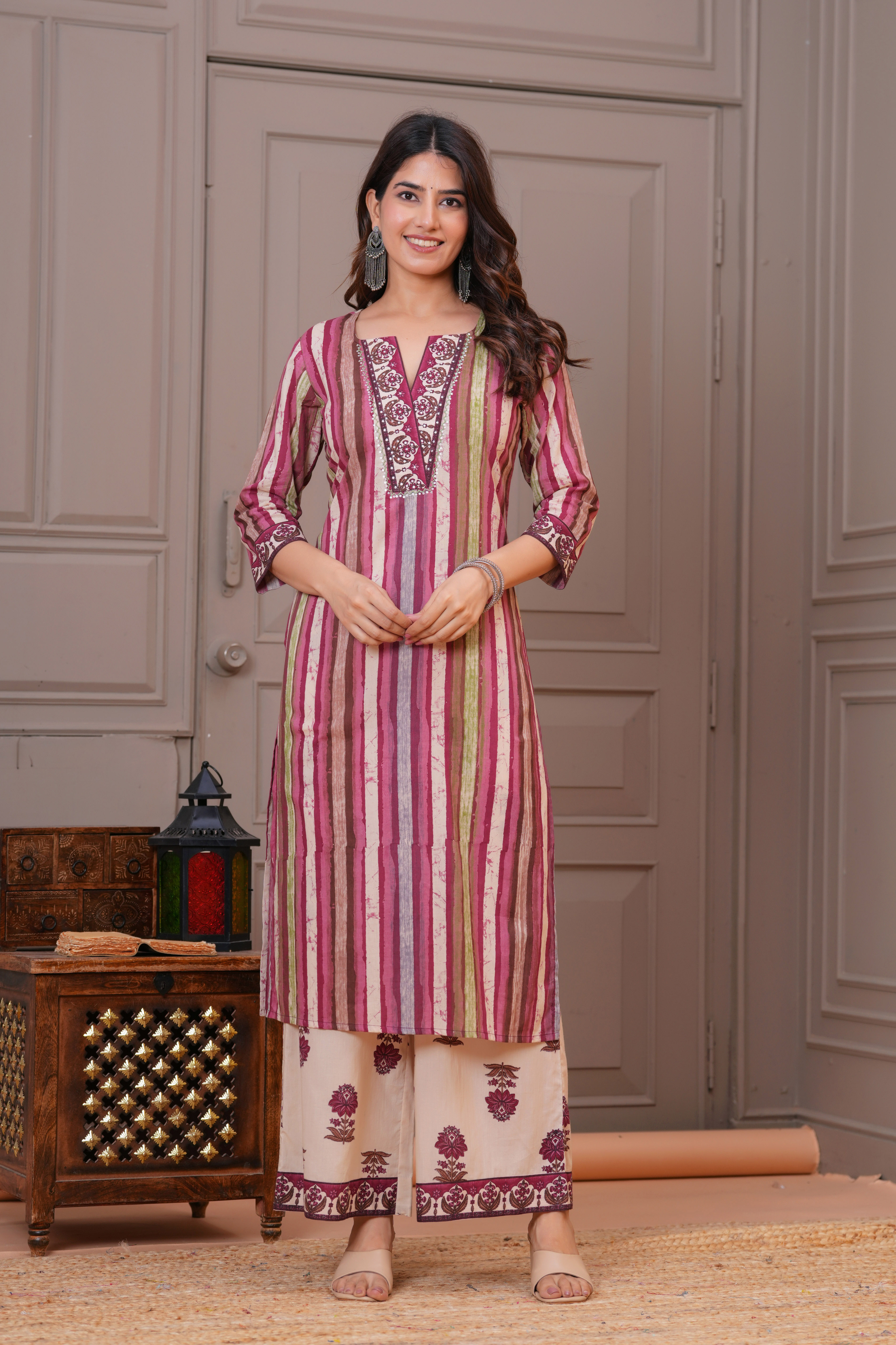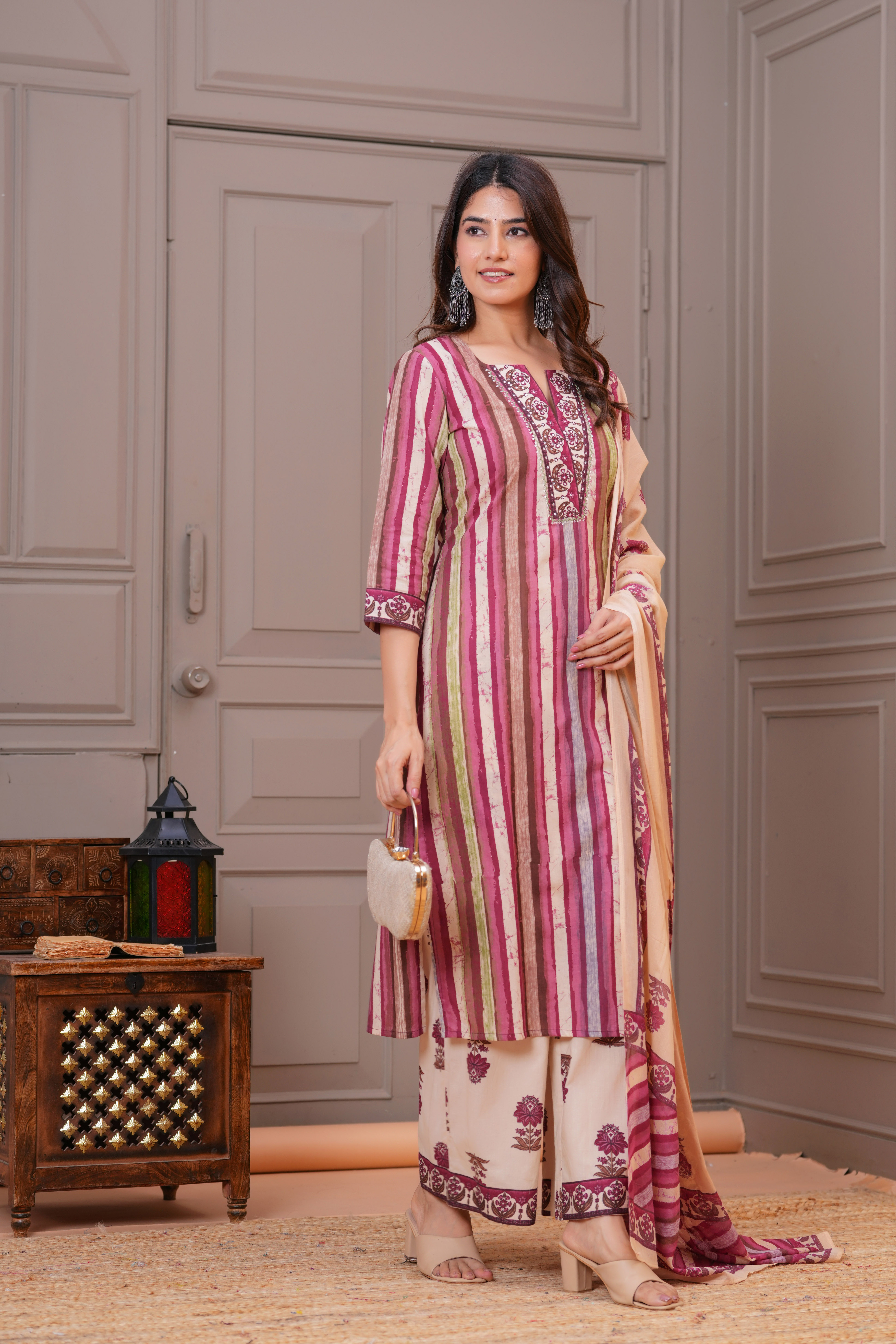 This cotton kurta set showcases a beautiful harmony of floral and stripe prints in elegant shades of Pink. The straight-cut kurta features a finely embroidered V-neckline with 3/4 sleeves and coordinated printed borders. The matching palazzo adds a subtle floral touch that complements the kurta’s vertical stripe pattern. Paired with a soft cotton dupatta featuring coordinated floral motifs and a bordered edge, this ensemble offers a graceful and feminine look — perfect for casual outings and festive gatherings.