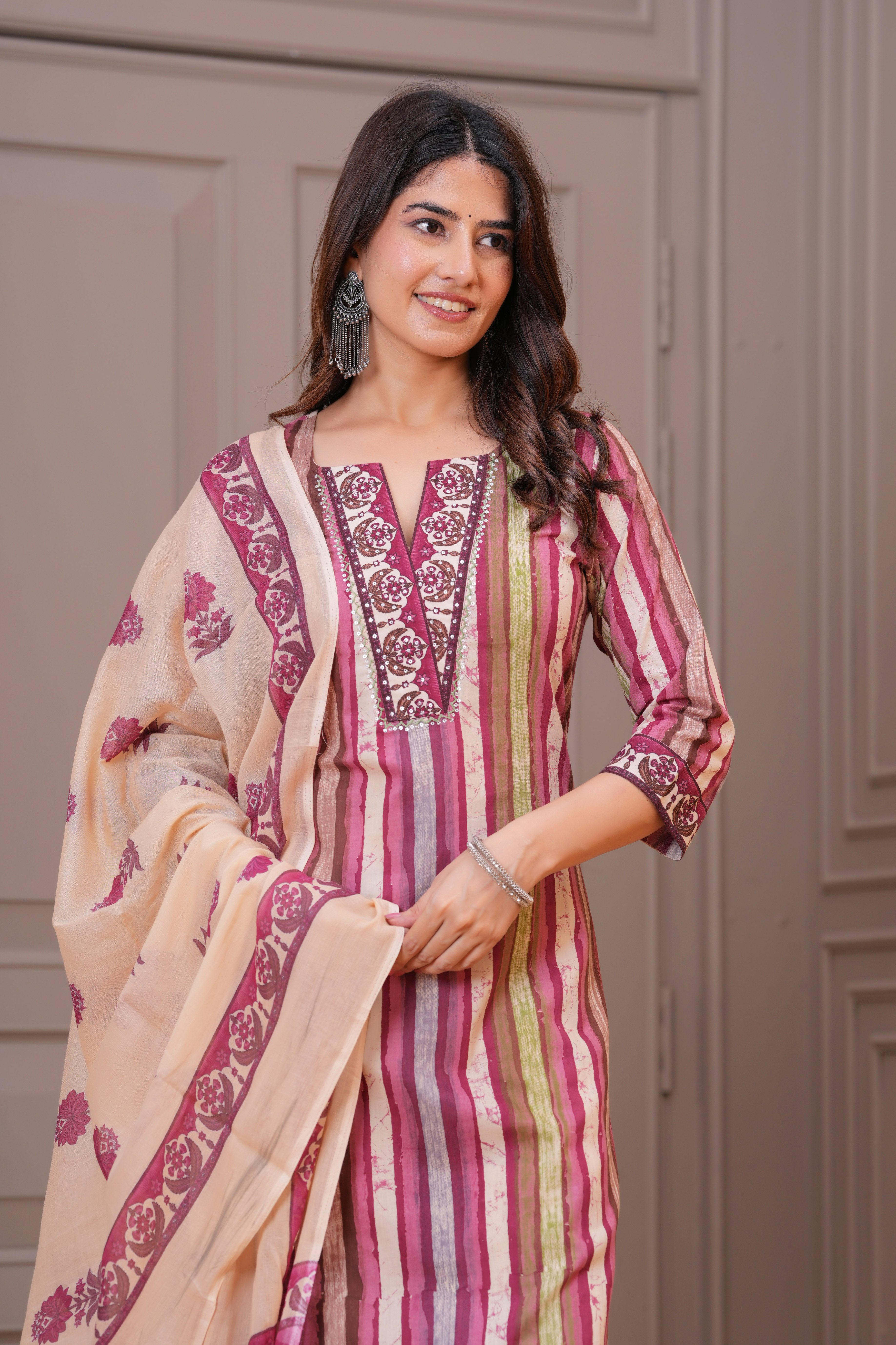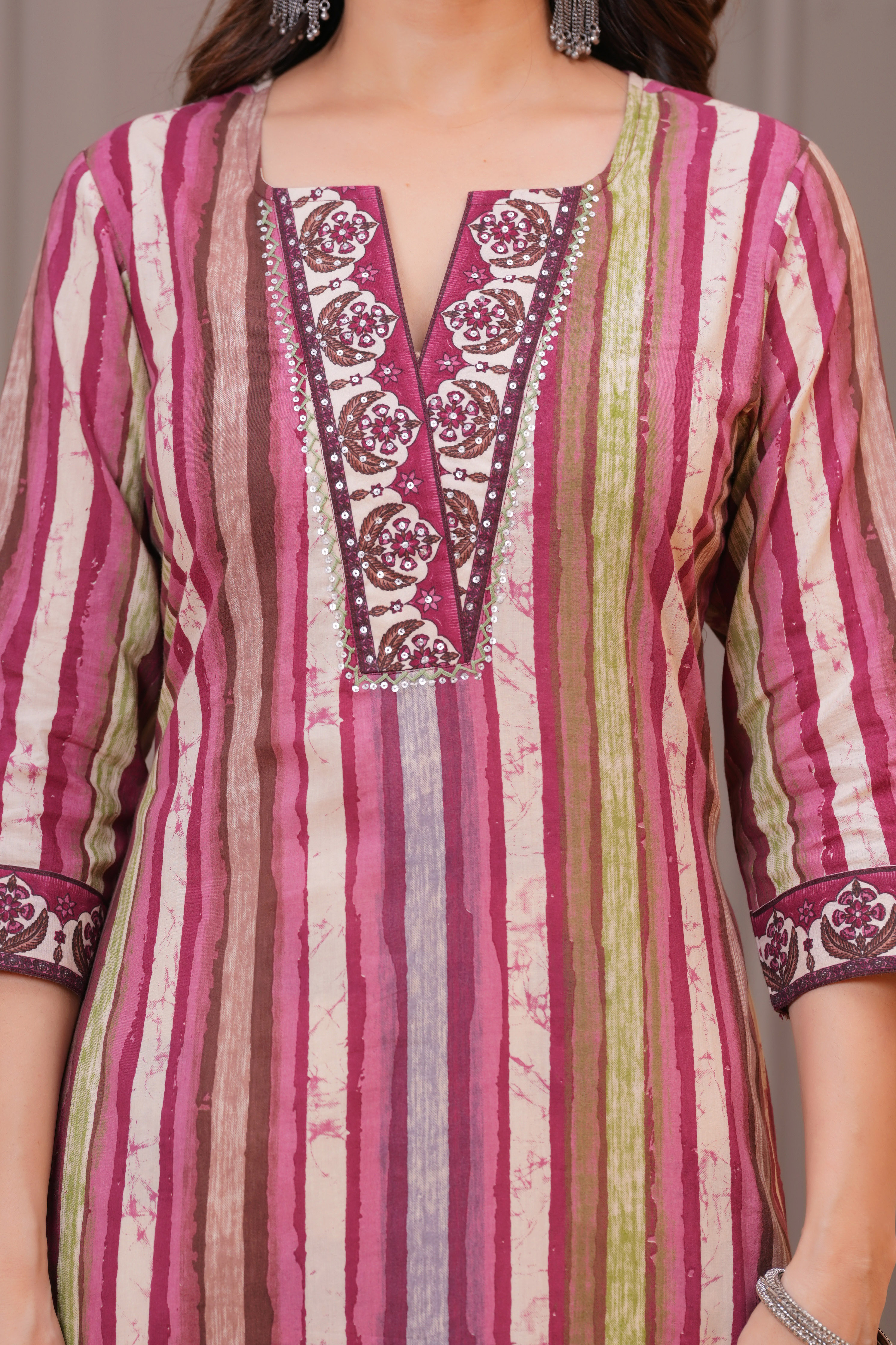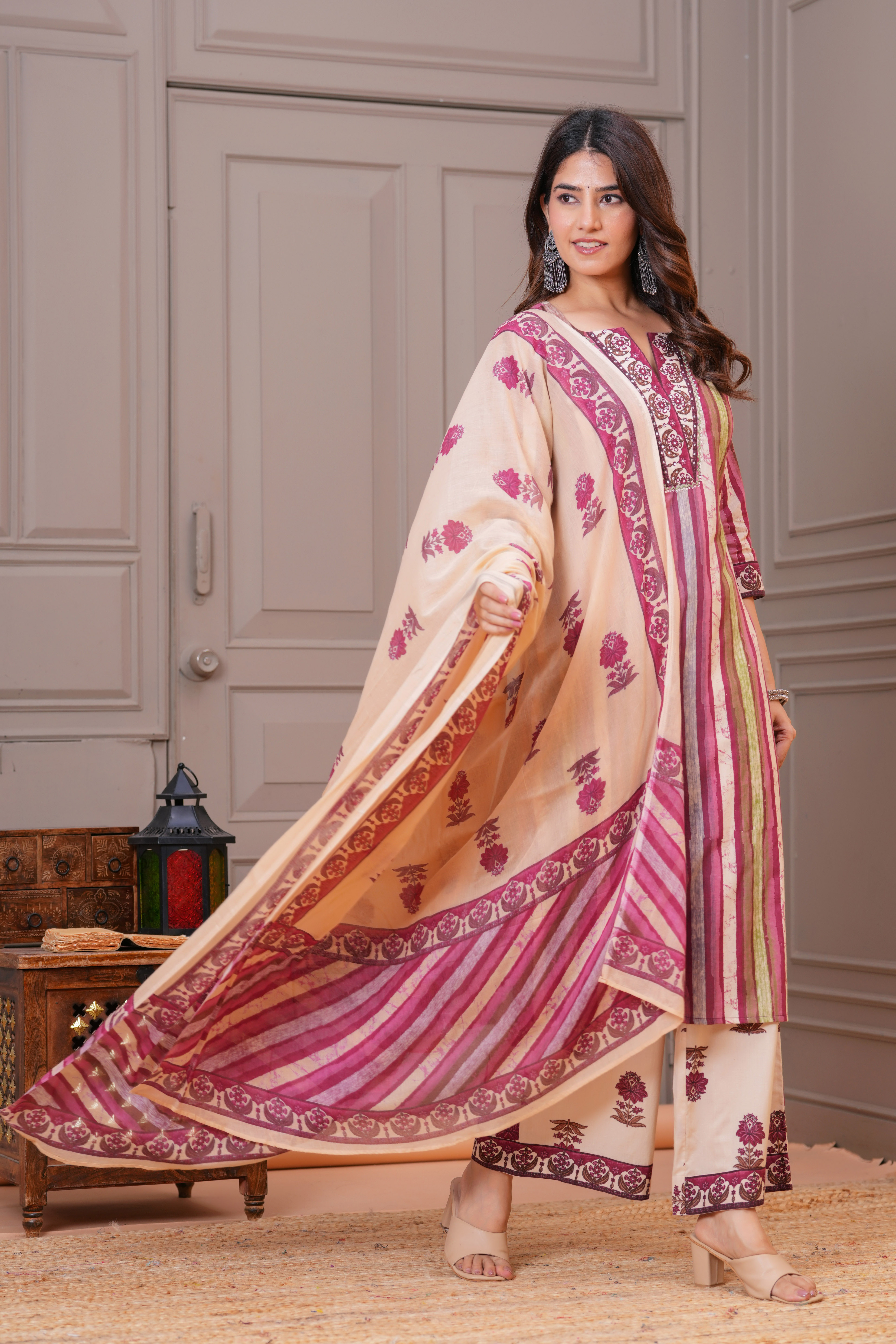 This cotton kurta set showcases a beautiful harmony of floral and stripe prints in elegant shades of Pink. The straight-cut kurta features a finely embroidered V-neckline with 3/4 sleeves and coordinated printed borders. The matching palazzo adds a subtle floral touch that complements the kurta’s vertical stripe pattern. Paired with a soft cotton dupatta featuring coordinated floral motifs and a bordered edge, this ensemble offers a graceful and feminine look — perfect for casual outings and festive gatherings.