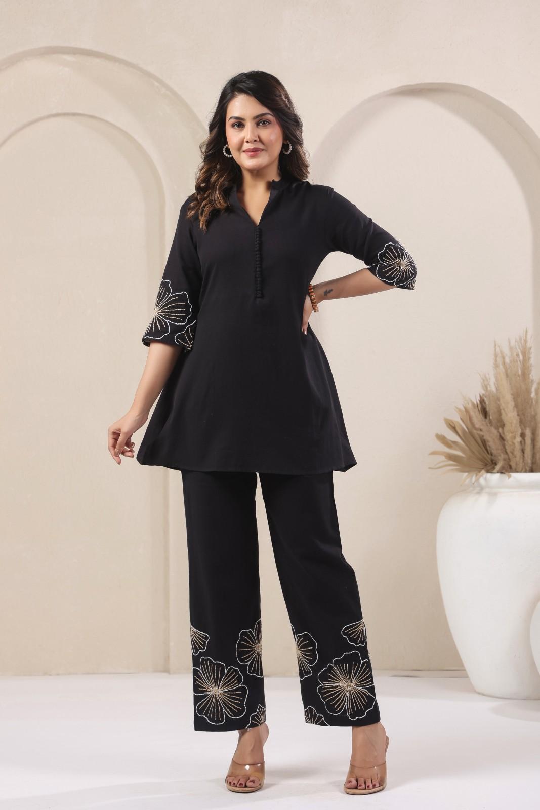 Elevate your style with our stylish A line Coord set for office and daily use, featuring chinese collar with slash neck, front potli button, thread embroidery done on sleeves and bottom that provides a chic and feminine Silhouette, making a great choice for office and daily ready.